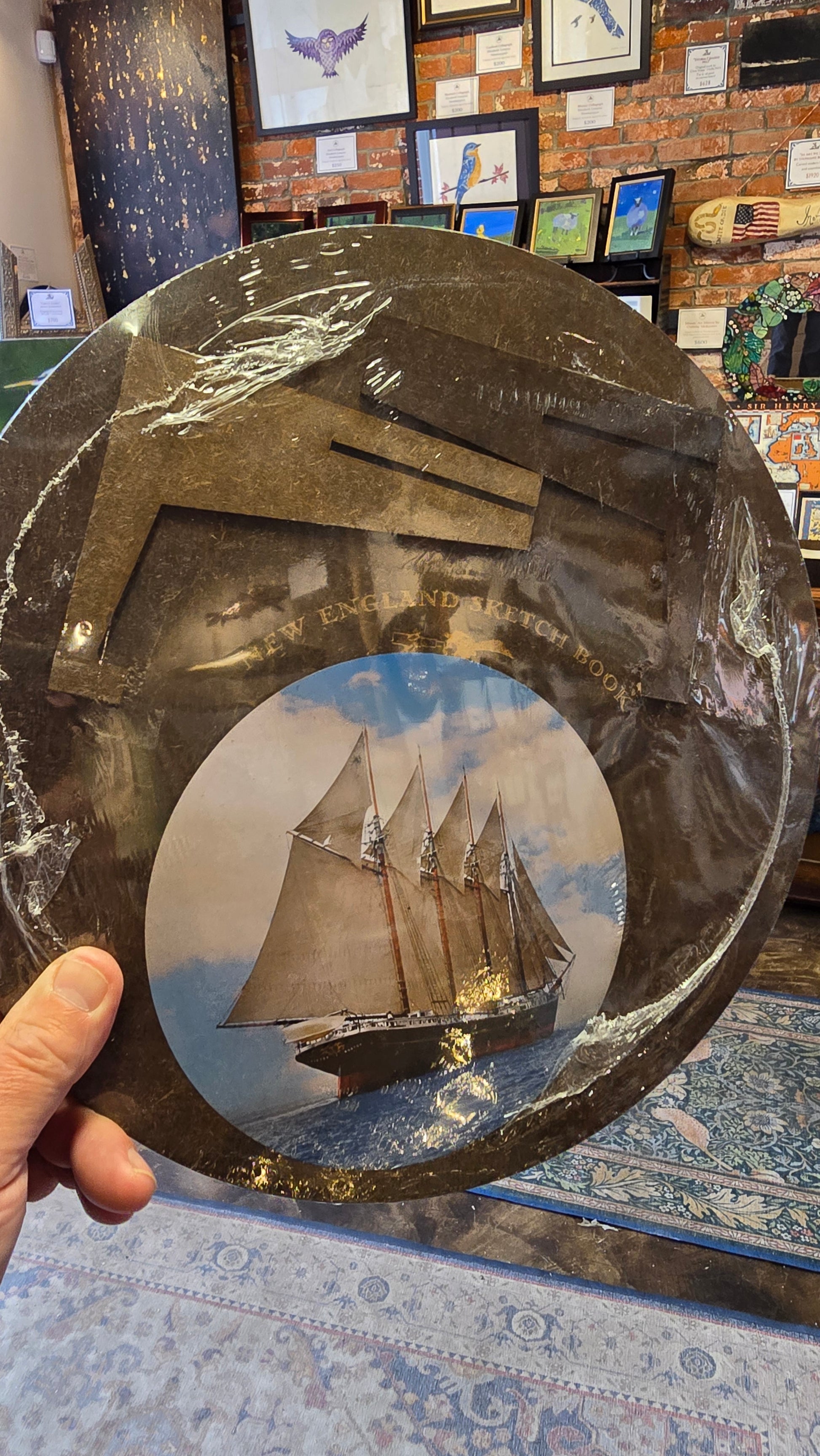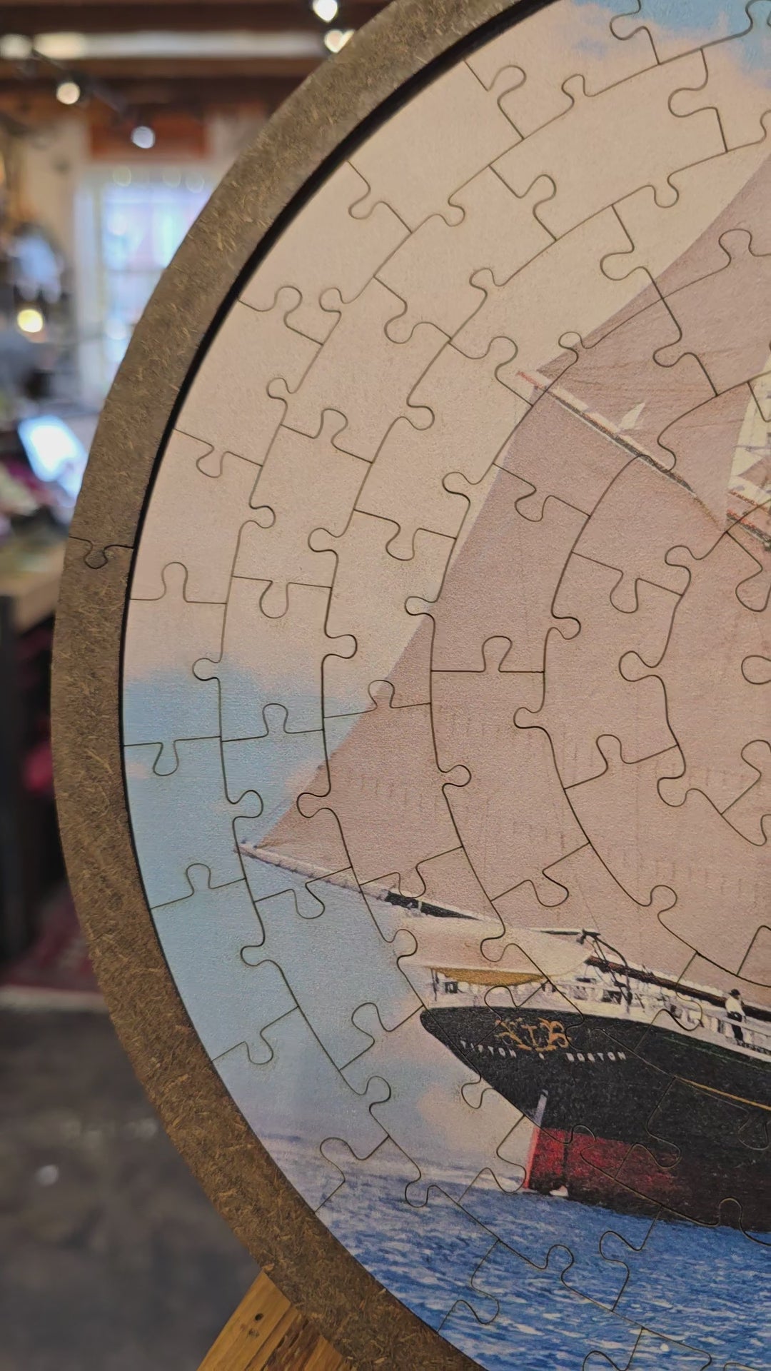 These 220-piece 12" circular artisanal wood puzzles are created with our wonderful NH partner and capture the majestic 4-Masted schooner "The Tifton" at full sail. This original striking image is part of the NESB glass negative collection and was colorized in 2025 to showcase the incredible detail of this wonderful ship.