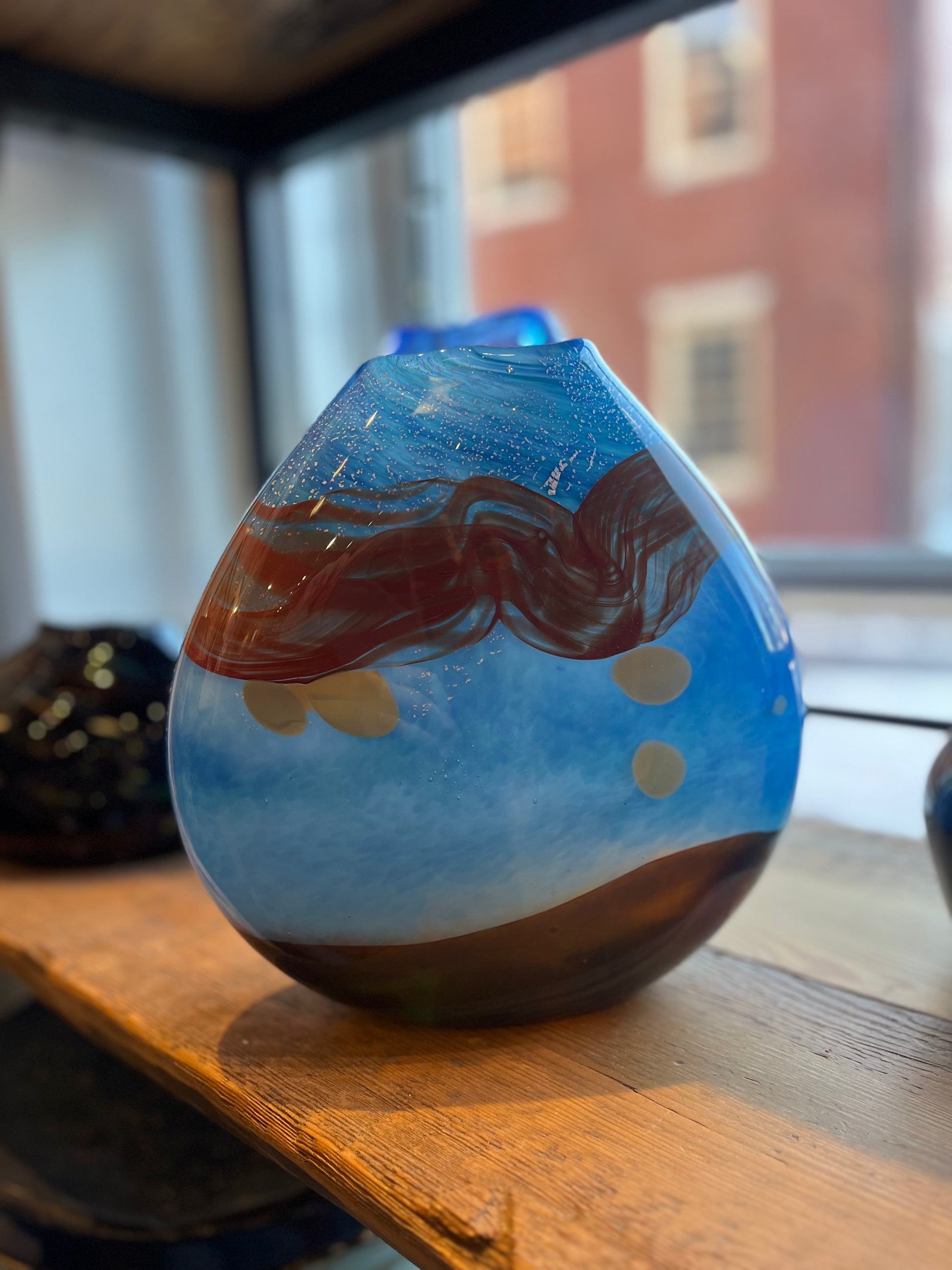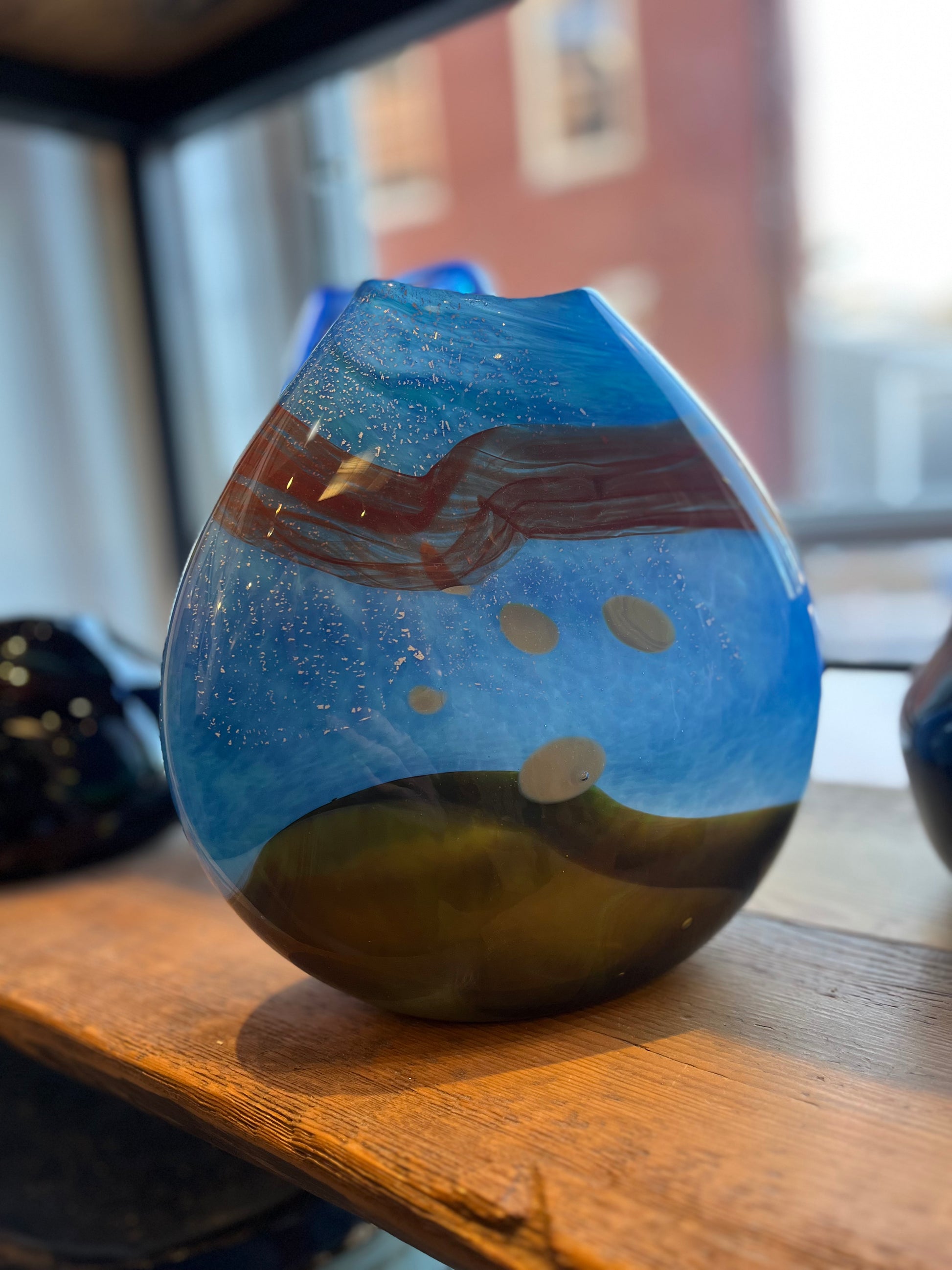 Working with hot molten glass, he layers earth-toned colors, patterns, and textures using an abstract painterly technique that brings life to the landscapes that inspire him. The results are unique hand-blown works of art.