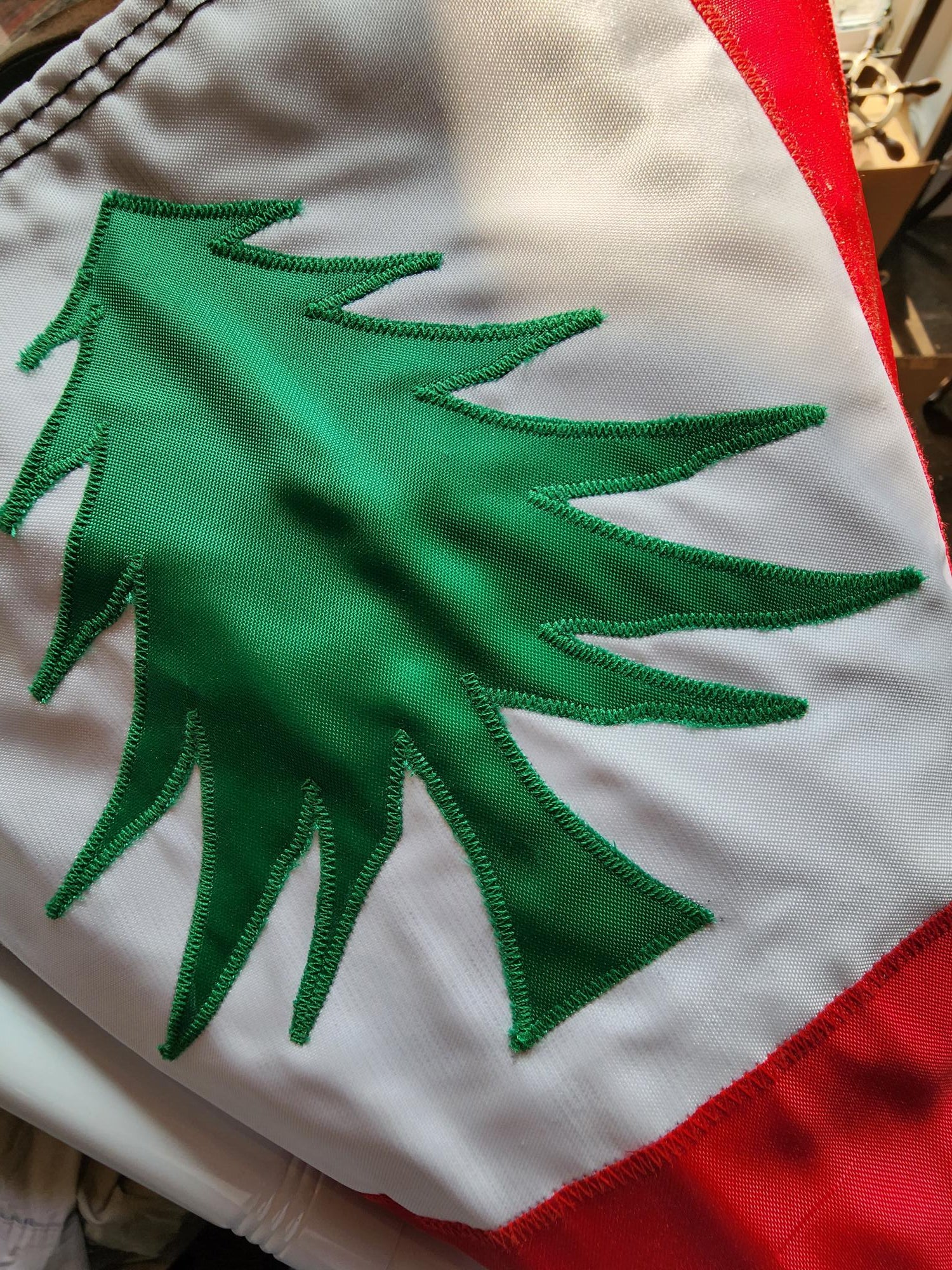 This incredibly special flag and made with hand-cut appliques and hand sewn in Woburn MA exclusively for New England Sketch Book. It was crafted by the areas oldest flag company, New England Flag & Banner, that has been in business since 1892 and have created the most iconic banners in the area including all of the Boston Garden championship banners for the Celtics and Bruins and Red Sox and Fenway championship flags and buntings all the way back to the first Boston Americans world series championship in 1903.