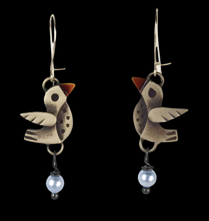 Each of these metal earrings features a charming pair of bird cast in sterling silver and antiqued with additional colored beak accents in orange enamel paint; each pair clutches a glass blue pearl as if it were their own egg. Gold-filled ear wires.