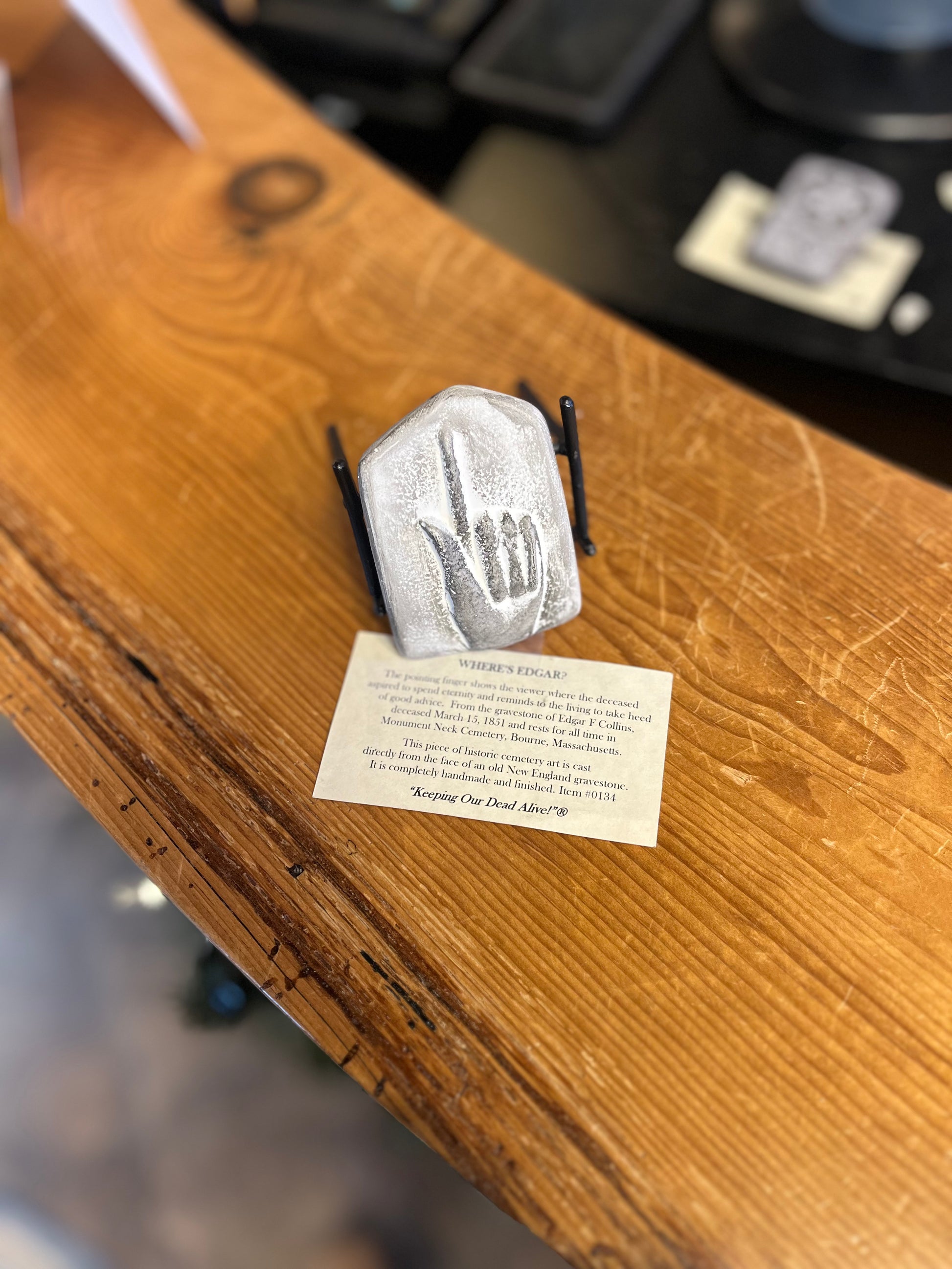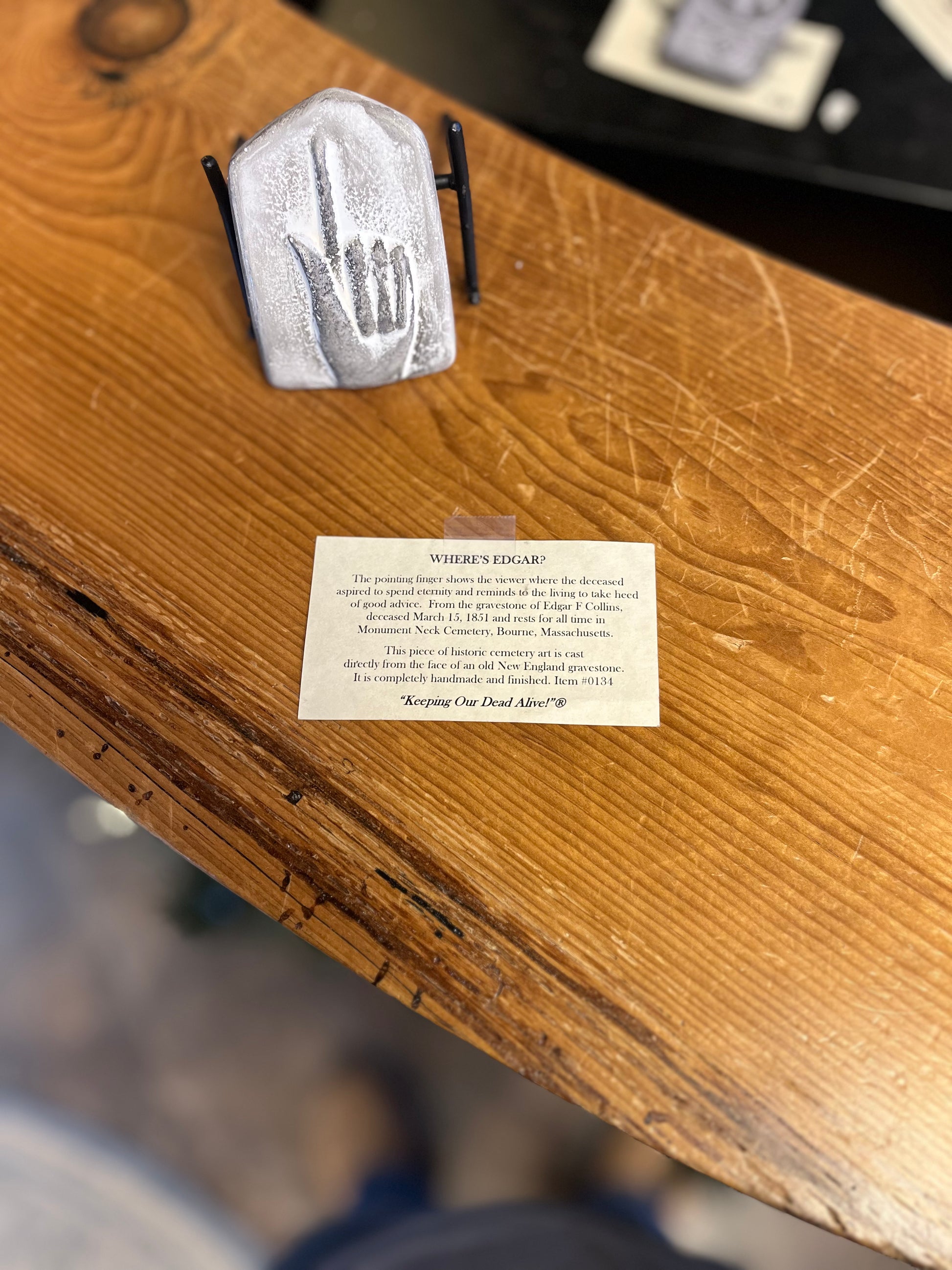 Where’s Edgar. The pointing finger shows the viewer where the deceased aspired to spend eternity and reminds to the living to take heed of good advice. From the gravestone of Edgar F Collins deceased, March 15, 1851 and rest for all time in monument neck cemetery Bourne, Massachusetts. This piece of historic cemetery art is cast directly from the face of an old New England gravestone. It is completely handmade and finished. Item#0134.