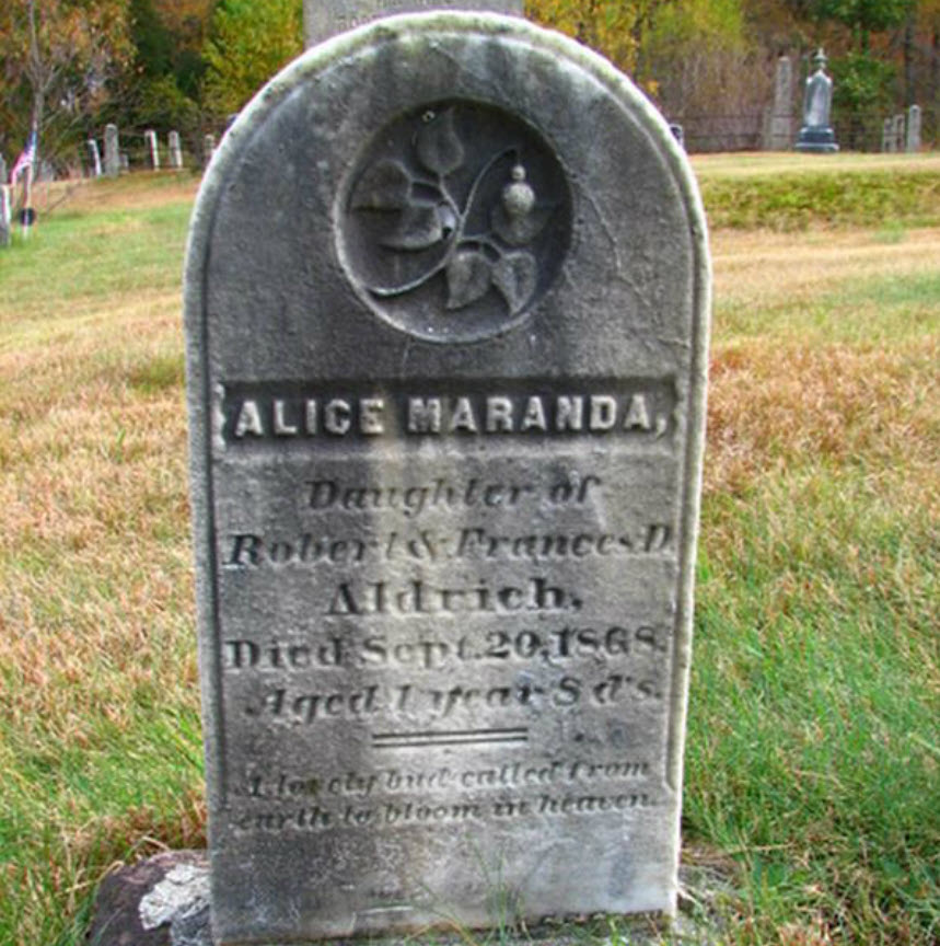 Alice Maranda, died September 20, 1868. Her stone is located in the Central Cemetery, Millville, Massachusetts. This delicate image is of a wilted flower which denotes the end or passing of life. Flowers were often used on women and children’s gravestones—a symbol of fragility.