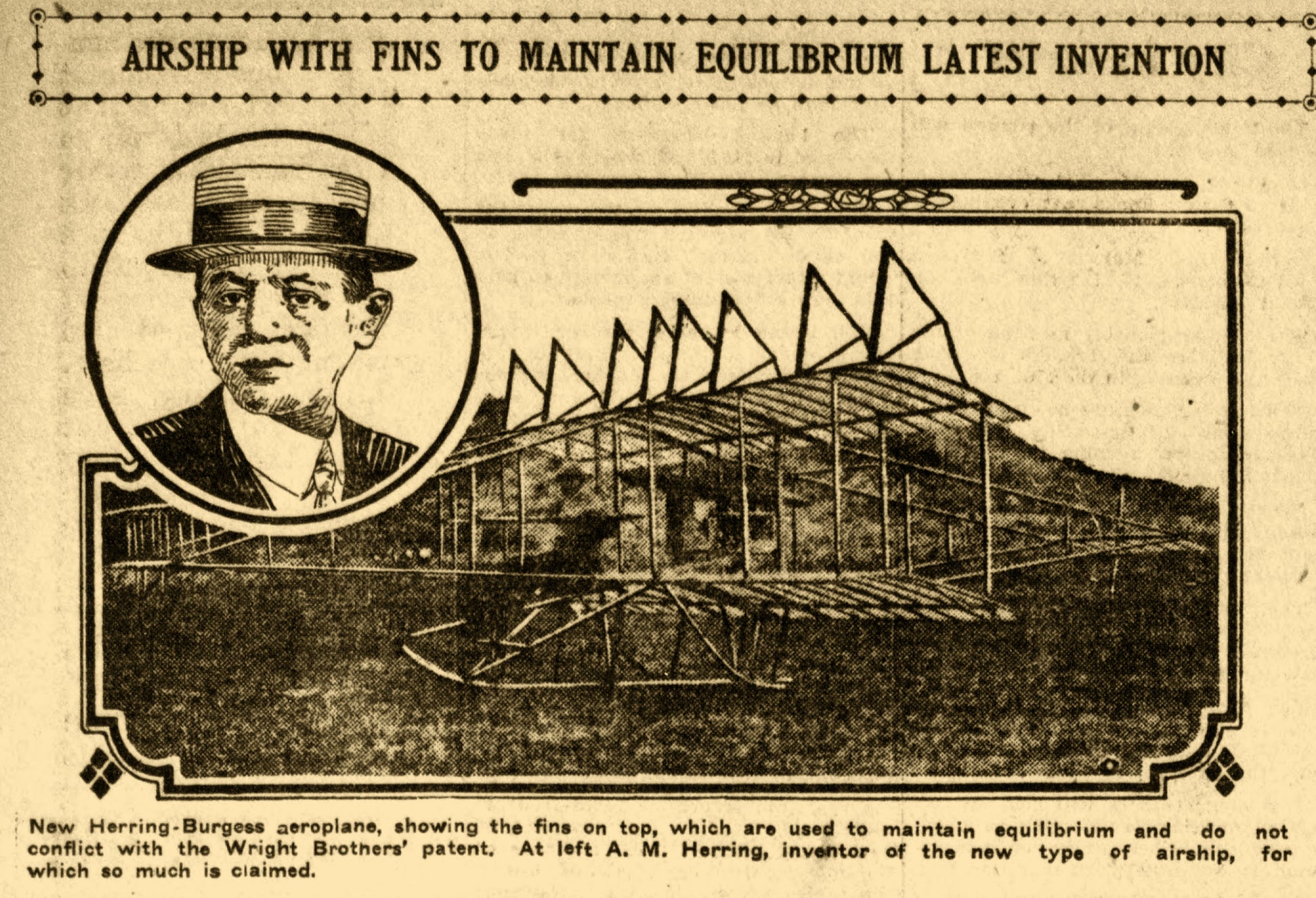 Newburyport, Mass., April 18. – Three successive aeroplane flights by A. M. Herring of New York and W. S. Burgess at Plum Island aviation field Sunday created a record for heavier than air machines when the big machine started on each one of its three flights by its own power in skids while resting on the ground.