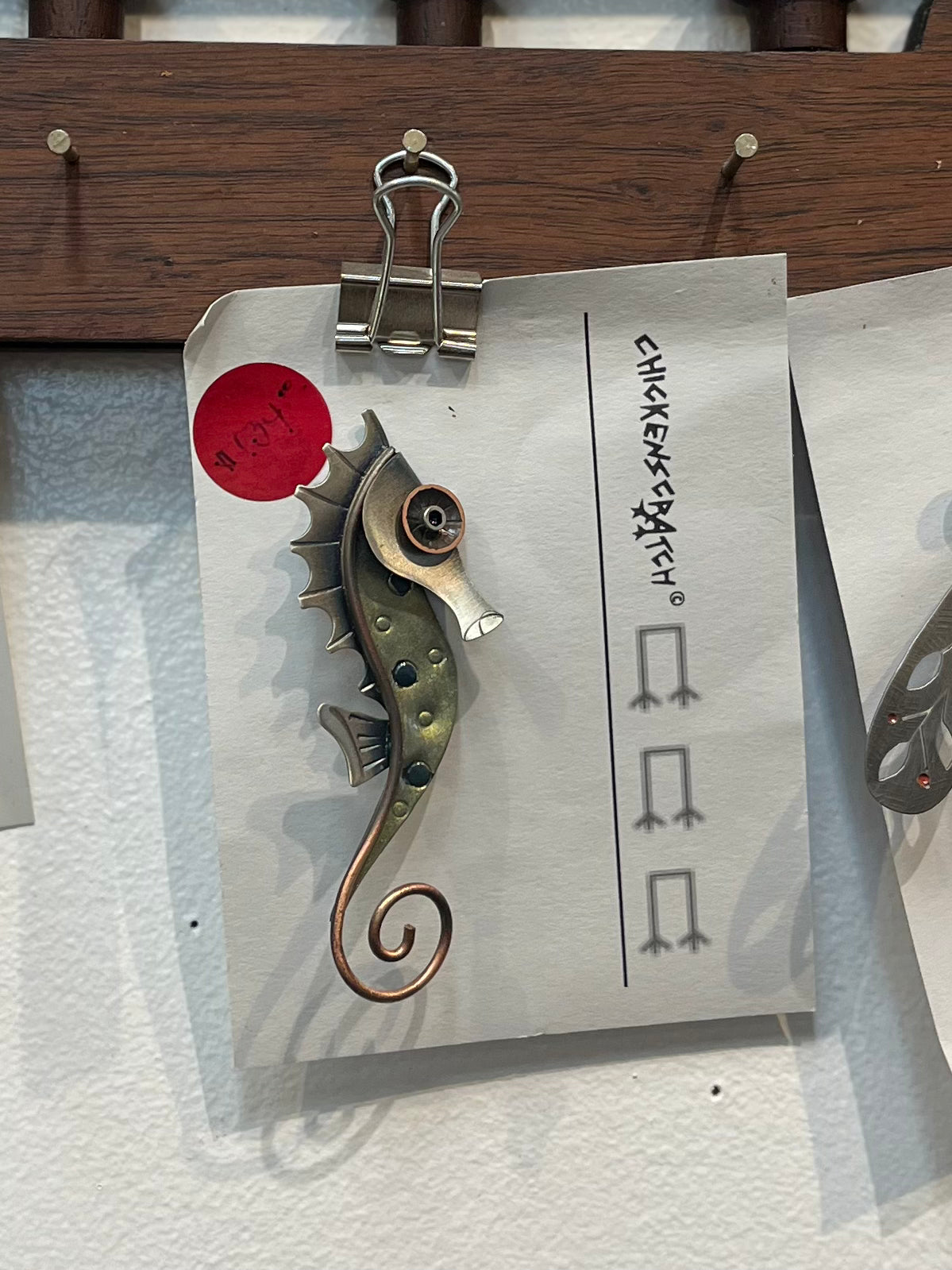 Most Chickenscratch jewelry is made from base metals (brass, copper, nickel silver and sterling silver) sheet and wire that is hand cut and manipulated, mixed with various plastics and found objects. Each piece has been joined with silver solder for strength and durability.