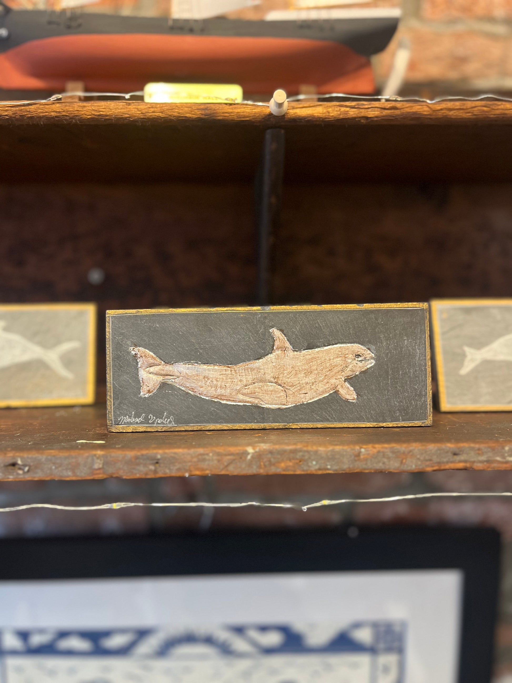 Trained as a sculptor, he recently began creating artistic personalized memorial stones as well as unique slate carvings. His work challenges the pictorial paradigms of additive imaging. “I honed my carving skills on old slate roof shingles which then became my primary medium. I use slate with outward signs of wear. Paint, tar, nail holes, fractures, chips and flaking tell of the slates former utilitarian life. The scars of its history rest on its surface while I cut through the patina revealing freshe