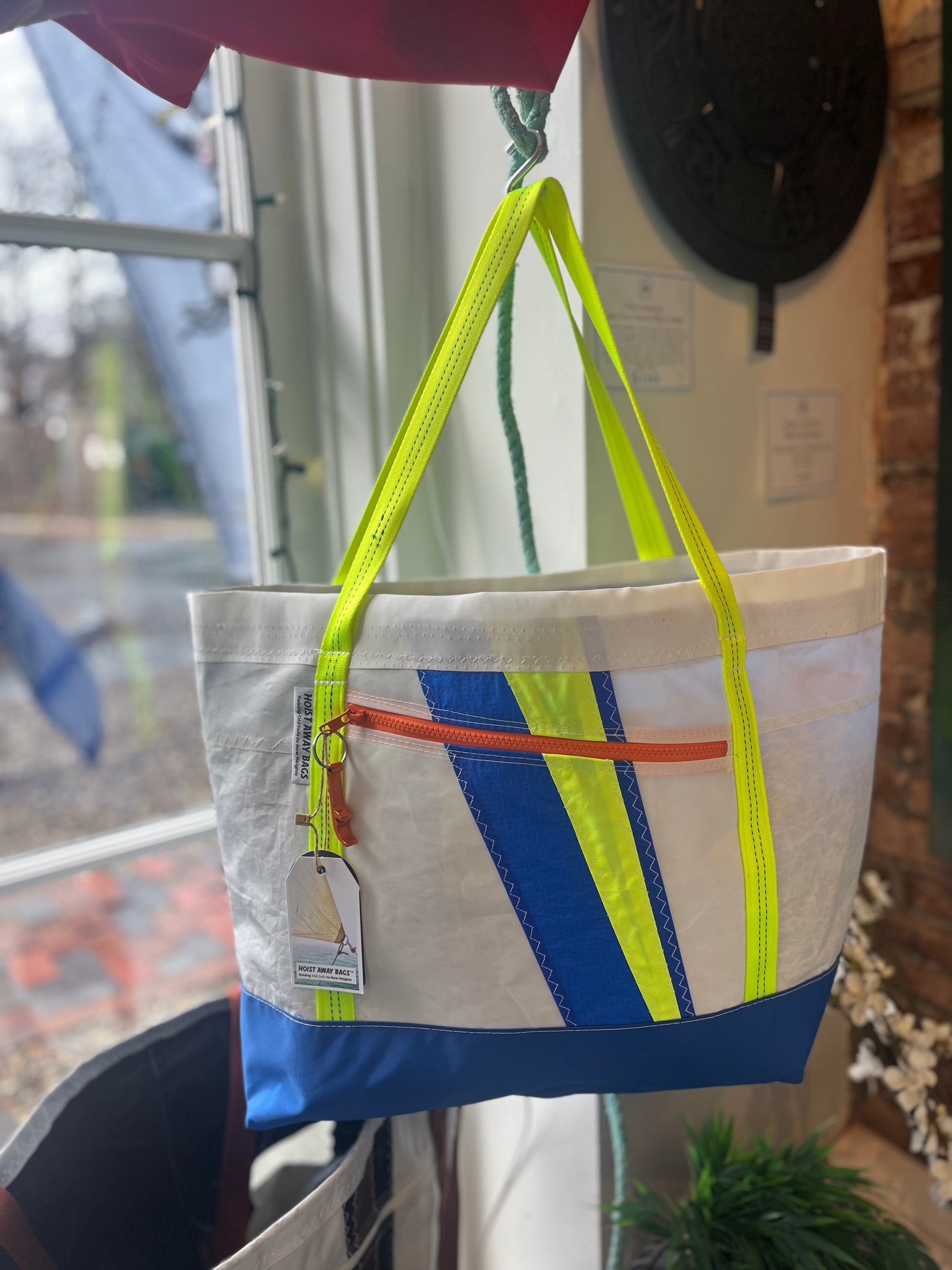 Crafted from genuine retired sailboat sails, each Sailcloth Bag is a unique, one-of-a-kind piece made in Stratham, New Hampshire. Stitched inside each bag is a bit of the sail legacy.