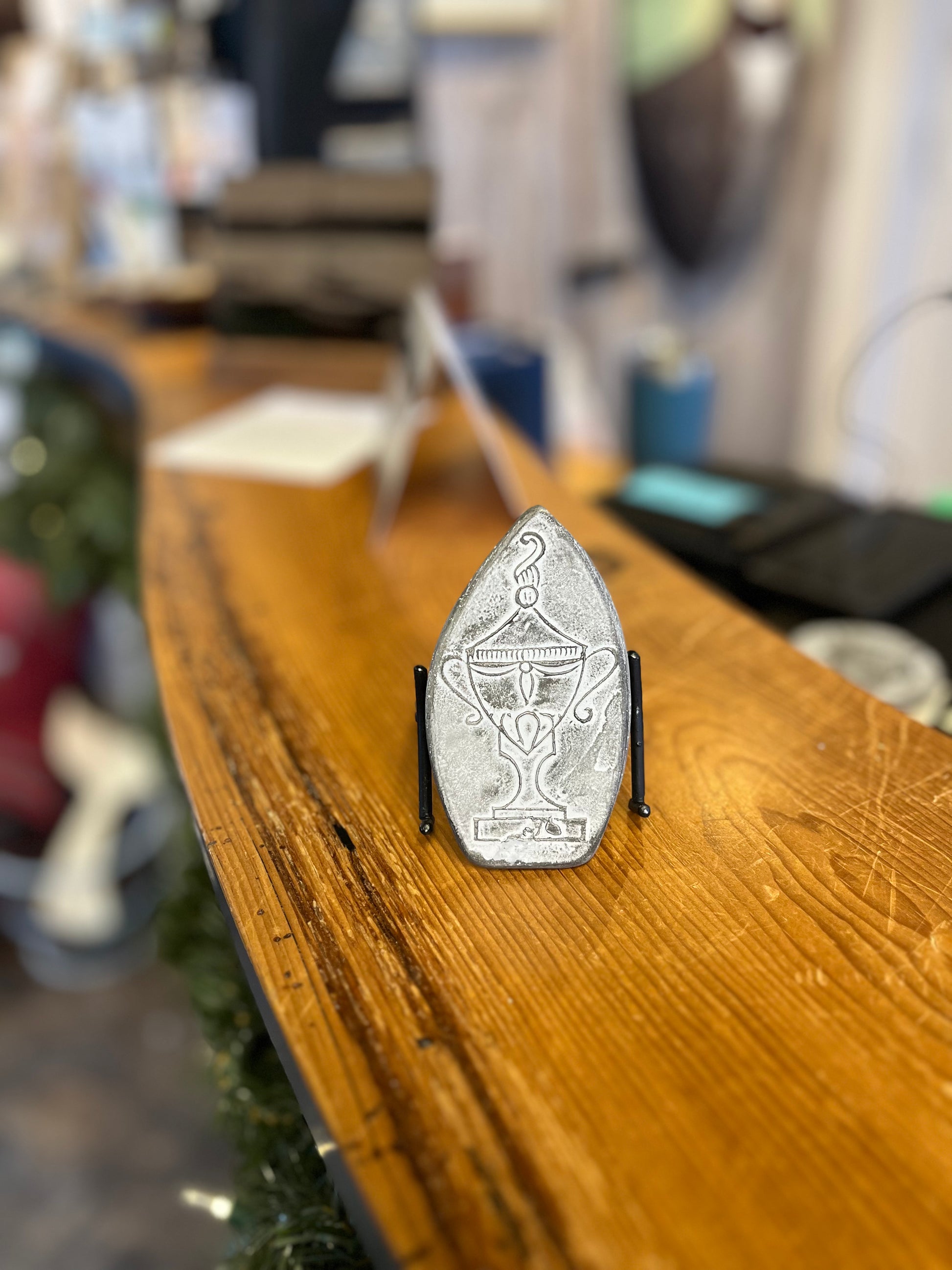 Susannah’s Urn. The urn is the vessel to carry earthly and spiritual remains from this life to the next. An eternal flame provides constant vigilance. From the gravestone of Susannah Peckham, died in 1813 and is buried in Blackstone Massachusetts. This piece of historic cemetery art is cast directly from the face of an old New England gravestone. It is completely handmade and finished. Item #0035.