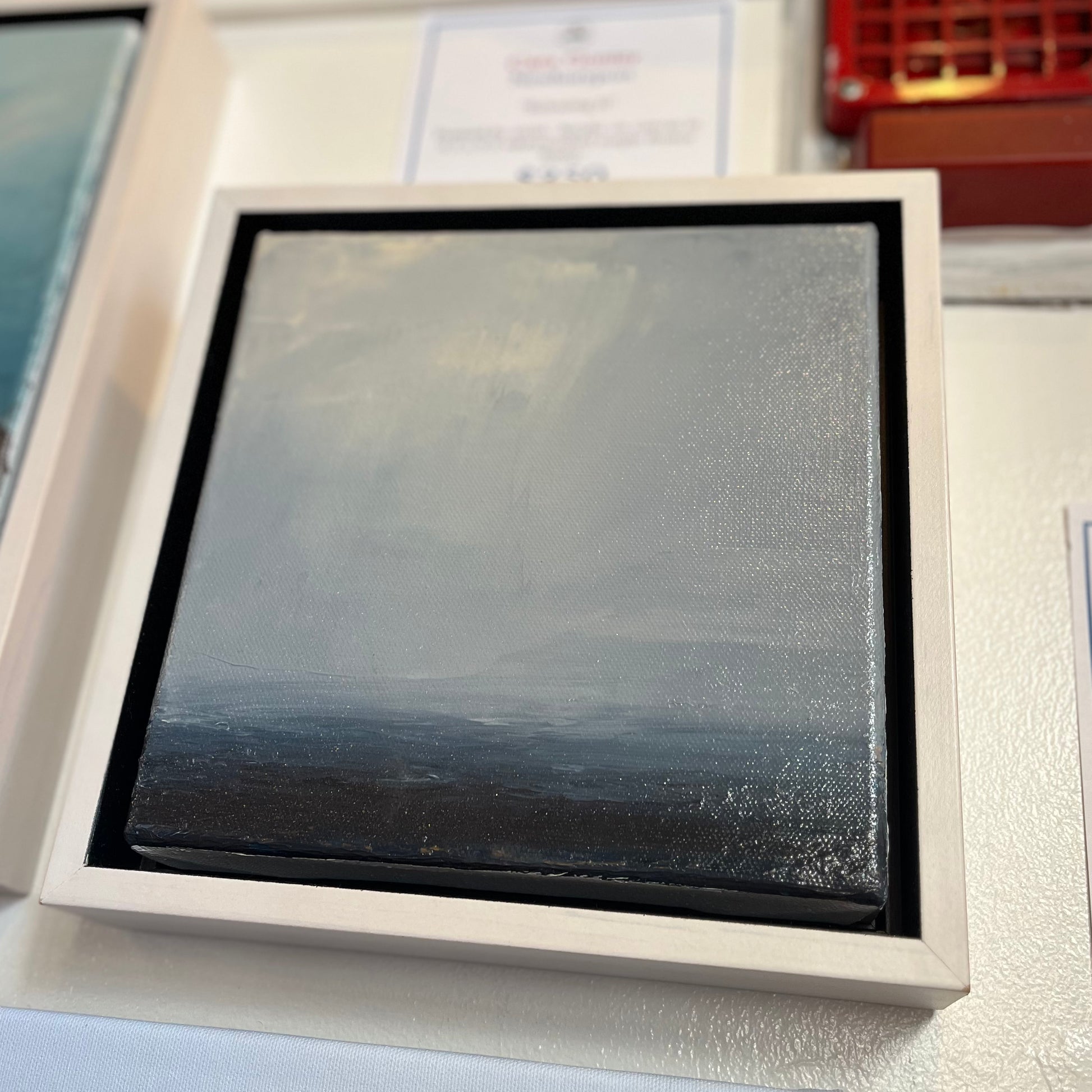 9.5” x 9.5” , acrylic on canvas in whitewashed maple floater frame.